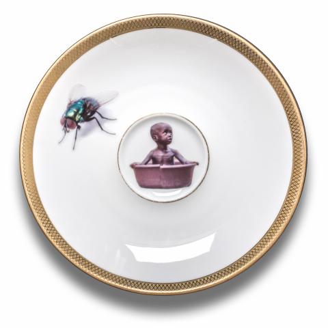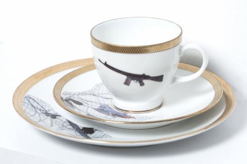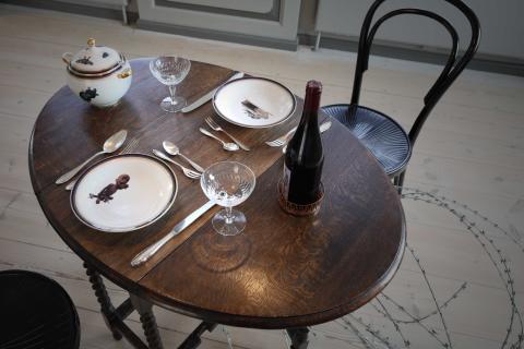 "Sylvia Henze works with the means of alienation, whose graceful table arrangement turns out on closer inspection to be a battle site entwined with NATO wire and holds out the prospect of a horror dinner that literally sticks in your throat. A thematic focus for the artist is existential questions of transience, processes of time and decay, but also the political dimensions of violence and war that keep our prevailing economic system of power going at an extremely high price."